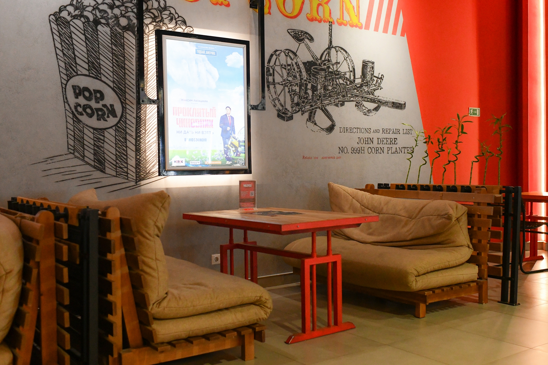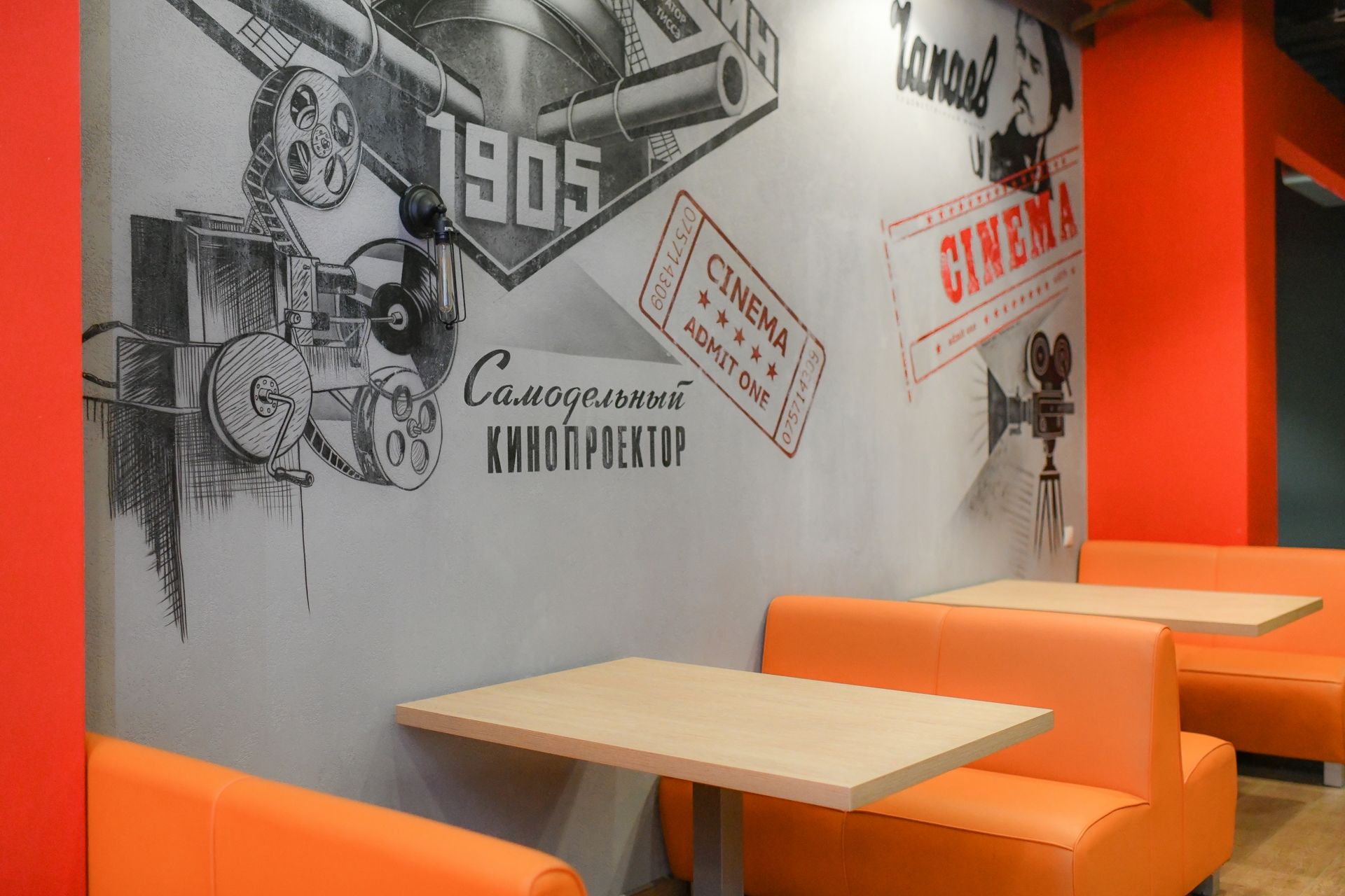 В зоне бара гостей ожидают 6 удобных столиков как для одного, так и для большой компании. Ассортимент бара может удивить: здесь есть разнообразные напитки, снеки, сладости, мороженое, разливное и бутилированное пиво, молочные коктейли, домашний лимонад стрит-фуд: сэндвичи, панини, шаверма, наггетсы, сырные палочки, картофель фри и пицца. Уютная атмосфера, вкусная пища, качественное обслуживание и интересное кино на ваш выбор – это замечательная возможность прекрасно провести время.